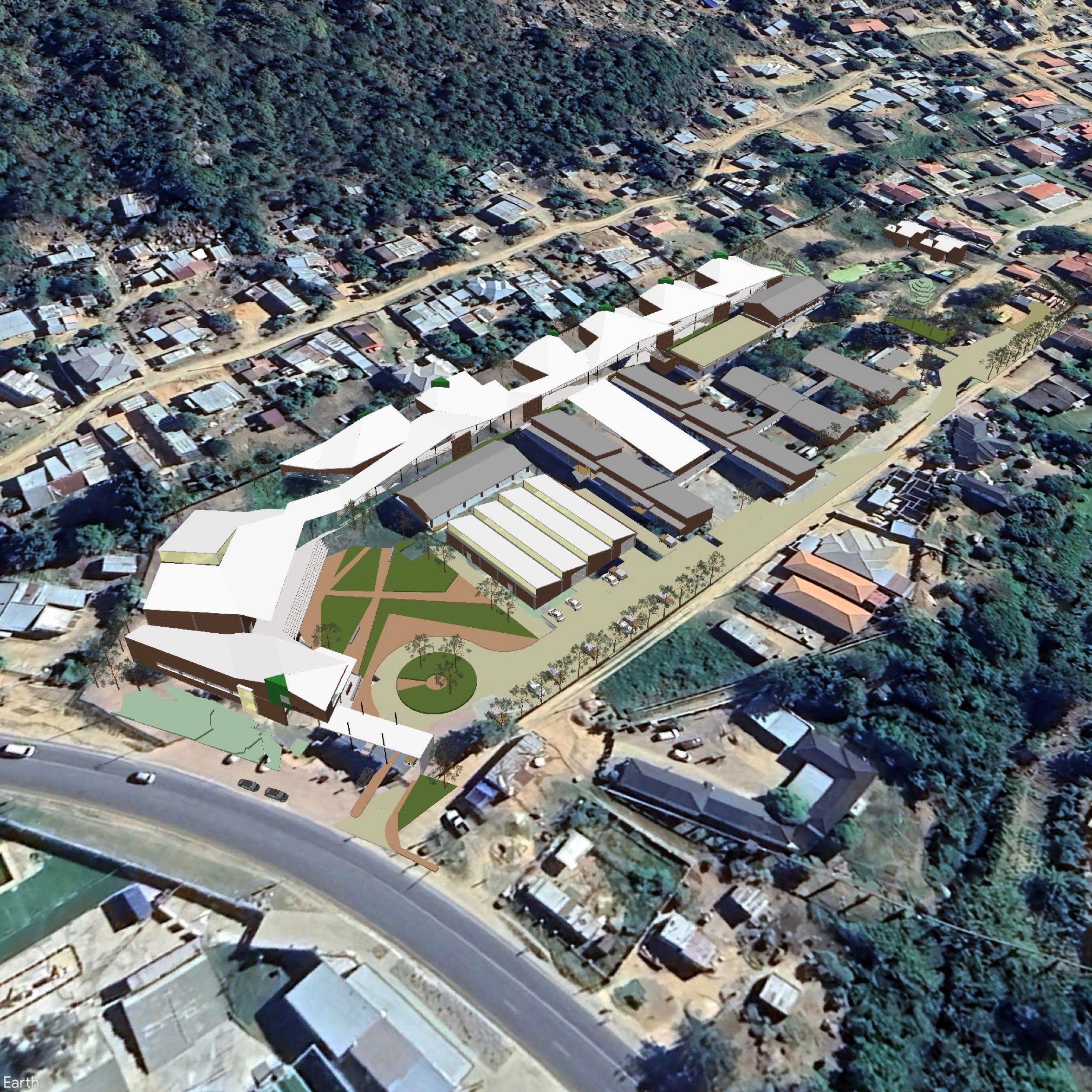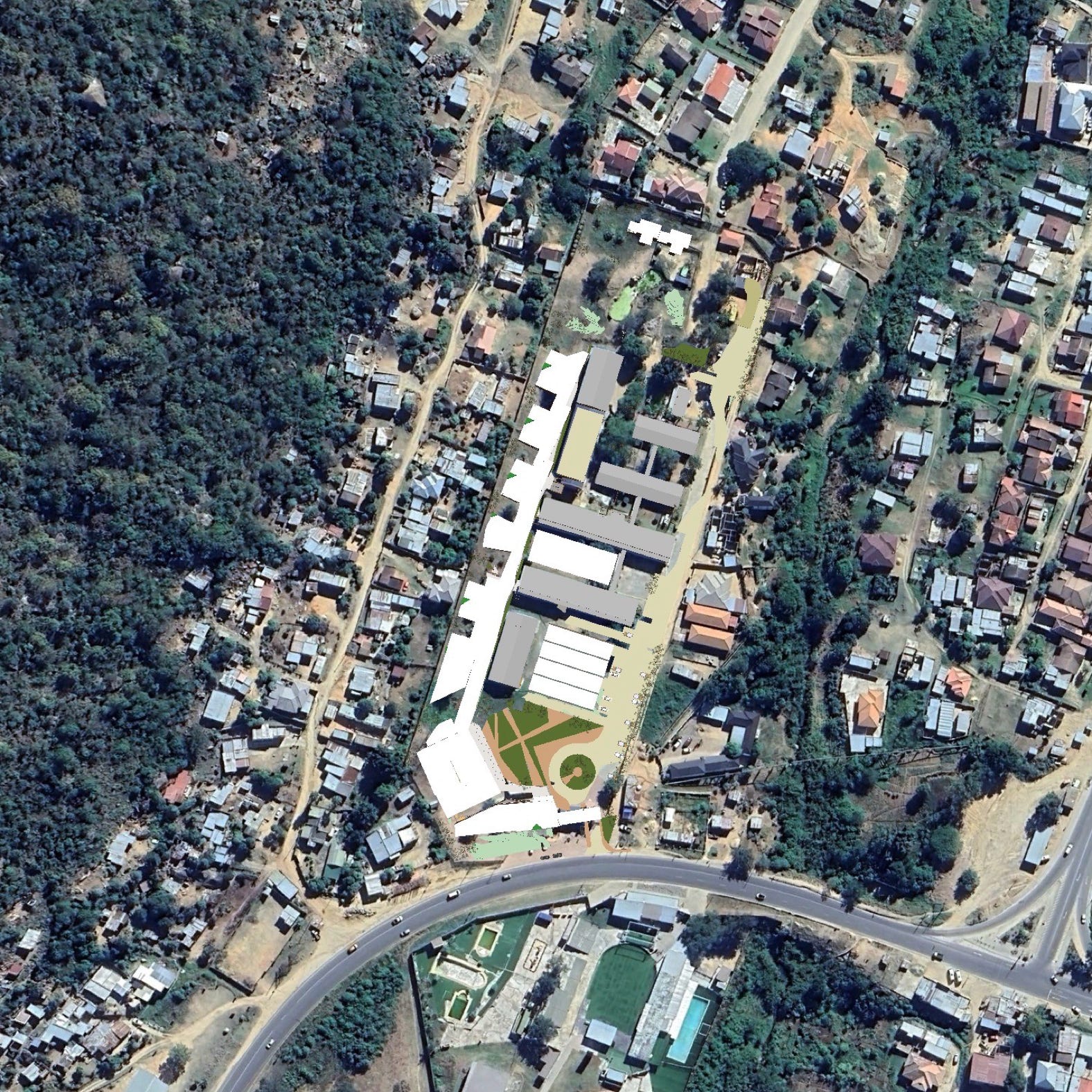 The existing faciity in Kanyamazane, Mombela, is a outdated vocational training school and the project seeks to both treble the teaching space and create a genuine campus environment, with a range of supporting facilities, for 1200 students. The site is partially bounded by informal settlement: along this boundary, a necklace of administration, hall, library lecture theatres and classrooms on two levels, is linked by a wandering, deep, veranda, overlooking the upgraded existing buildings.