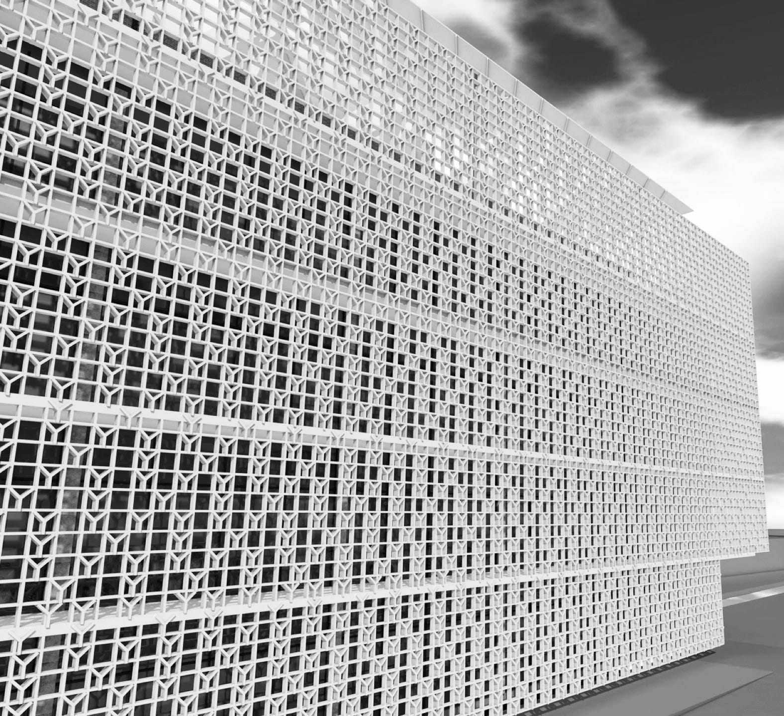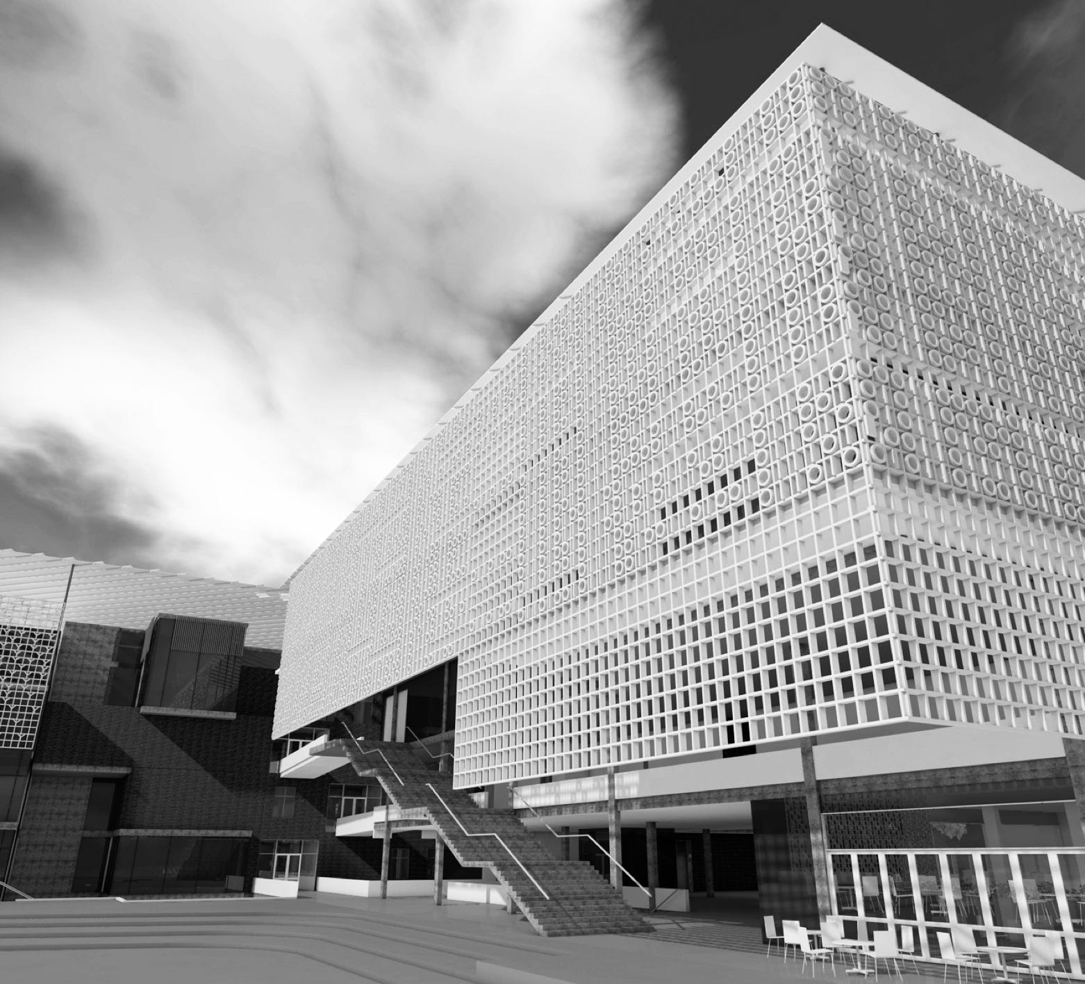 The new University of Mpumalamga central building combines teaching, assembly and library facilities, all wrapped with screens which temper the strong lowveld light. The screen blocks use binary code to repeat the phrase “ learning is light” in all eleven South African official languages. The pedestrian way from the foot of the future campus cuts through the two halfves of the complex. A cloud of photovoltaic panels provides a horizontal screen to the roof.
