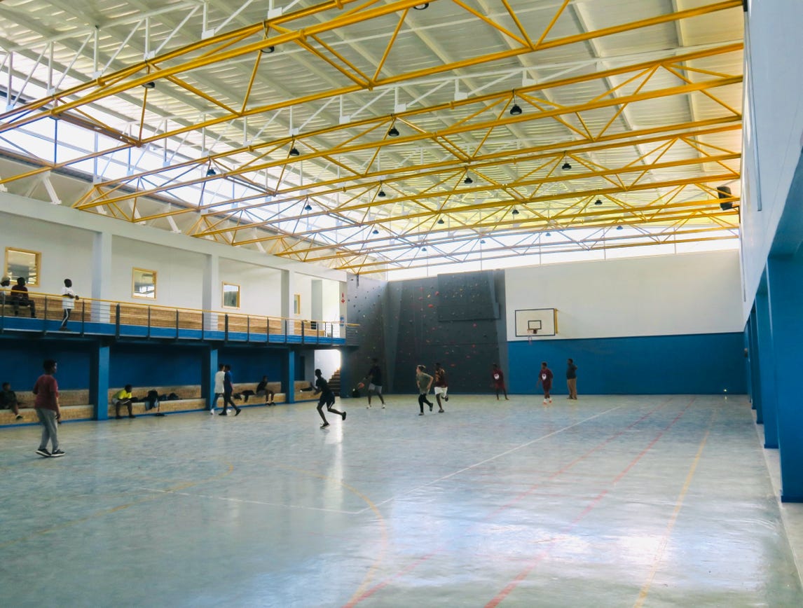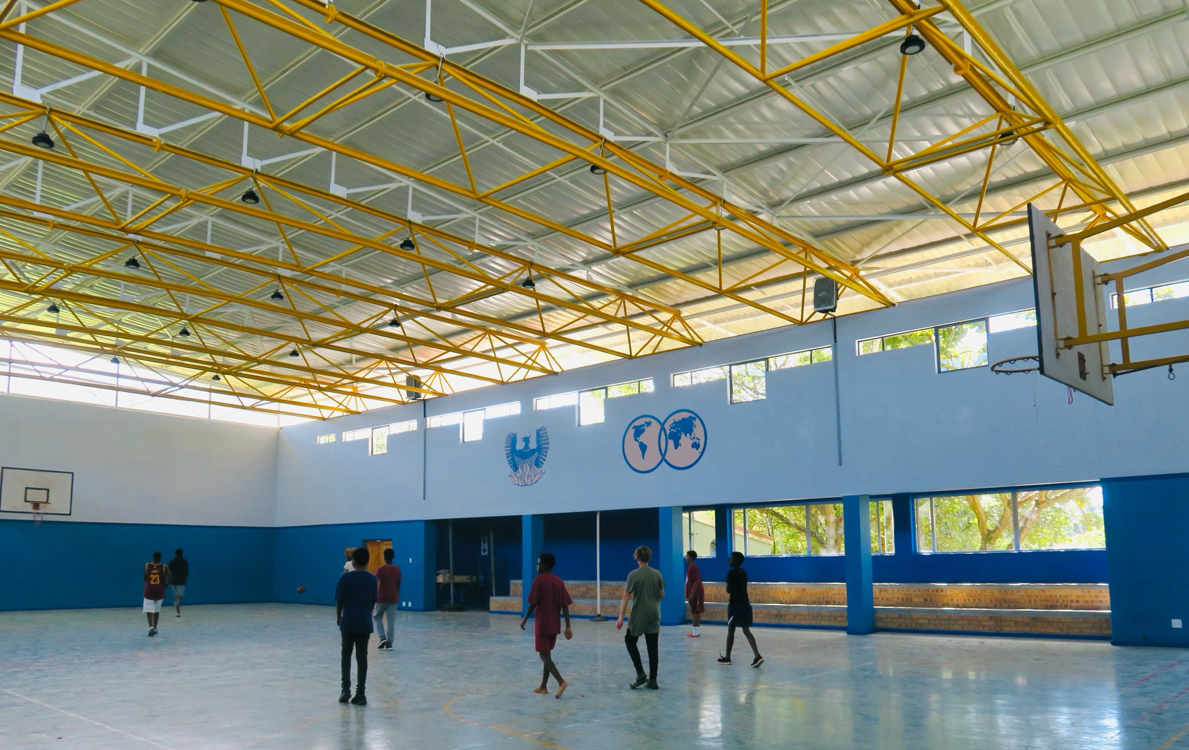 An existing multipurpose hall, built in 1985, was altered to become a light filled modern hall with a spectator gallery, facilities such as a weight training room, offices and stores.